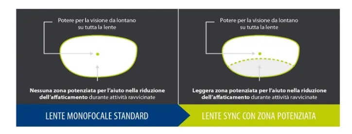 Rispetto alle lenti monofocali standard, che hanno un potere per la visione da lontano su tutta la lente, le lenti a supporto accomodativo presentano diverse zone di supporto e hanno in più una lieve zona potenziata nella loro parte più bassa che serve a limitare l’affaticamento degli occhi durante le attività ravvicinate. Questa zona, in particolare, supporta e rilassa i muscoli oculari, garantendo una messa a fuoco più semplice, in tal modo previene i disturbi di affaticamento visivo e ne riduce l’intensità nei casi in cui siano già presenti. Queste sono consigliate a chiunque passi più di due ore di fronte a schermi digitali.
